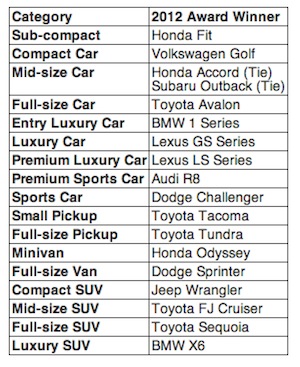 Toyota, Lexus, Subaru and Honda combined to win 11 first-place 2012 Canadian Black Book Retained Value Awards, while European automakers took home four, and of the domestic manufacturers, Chrysler took home three. There was one tie.