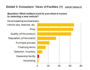 The researchers did capture some consumer survey data based on surveys of a few hundred in-market consumers. This data shows that consumers rank facilities near the bottom of considerations when it comes to selecting either a new vehicle or a dealer.