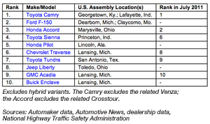 This year, Toyota, Honda and General Motors combined for eight of the 10 vehicles on the list. General Motors held three cars on the list with the Traverse (6), Acadia (9) and Enclave (10) all built in Lansing, Michigan. In addition to the No .1 rank, Toyota also has the Sienna (4) and Tundra (7) on the list. Honda’s Accord dropped to third this year because of the re-entry of the F-150 on the index and the Pilot took the fifth position. Chrysler’s Jeep Liberty (8) appeared on the AMI for the first time.