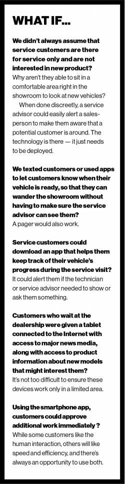 SOMETIMES ADDED AMENITIES ARE NOT ENOUGH IN THE SERVICE WAITING AREA.WHAT DOES THE FUTURE HOLD FOR THE AUTOMOBILE?