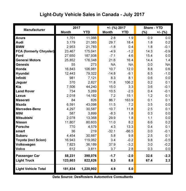 July truck sales, including SUVs, were up 8.3 per cent from 2016, while passenger car sales fell by 1.7 per cent. Trucks increased their share of the market to 67.4 per cent, year-to-date, compared to 32.6 per cent for passenger cars.