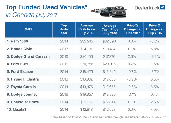 Dealertrack’s list of Top Funded Used Vehicles in Canada, along with Average Cash Prices in July remained consistent with June.