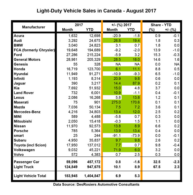 August was the fourth consecutive month and the seventh this year to set an all-time record for the respective month, with sales of 183,945 new cars, trucks and utility vehicles up 6.9% from August 2016. According Global Automakers of Canada (GAC) August sales were fully 10% ahead of the five-year historical average for the month.