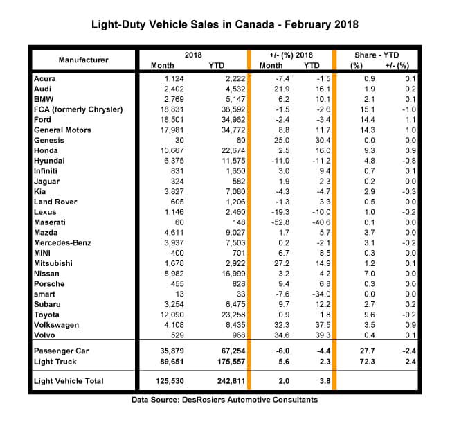 Fiat Chrysler Automobiles (FCA) claimed monthly sales leadership again in February with 18,831 vehicles sold, although that figure was down 1.5% from a year ago. It’s year-to-date sales of 36,592 units are down 2.6%, giving up a full percentage point of market share, to 15.1%.
