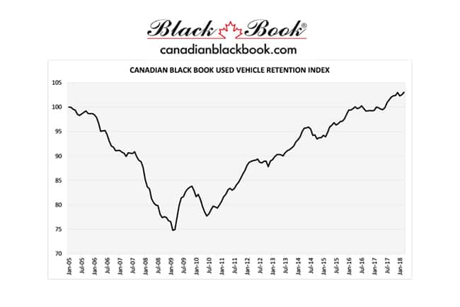 The Canadian Black Book Used Vehicle Retention Index for March 2018 reached the same all-time high of 103.0 that was set in December 2017, according to a CBB news release.