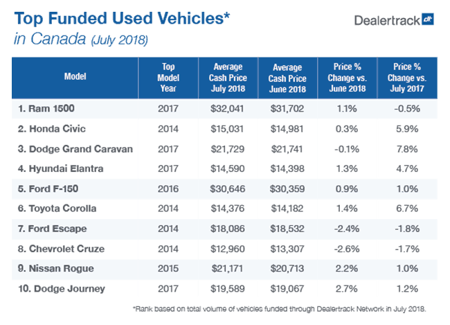 July numbers for Cox Automotive Canada’s Dealertrack Top 10 Funded Used Vehicles Index show a minor slowdown in overall used vehicle pricing compared to the previous month. A year-over-year comparison shows a 2.4 per cent increase in July 2018. But when compared with prices recorded in June, 2018, July saw a flat 0.5 per cent gain.