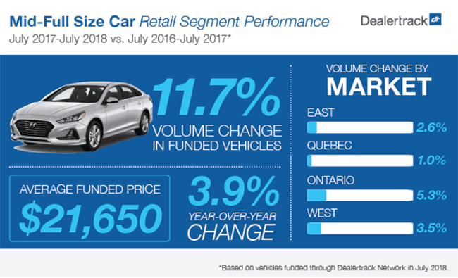 The company also offers customized dealer reports to clients, such as the used Mid-Full Size Car Retail Segment Performance Report, which showed an 11.7 per cent gain in overall volume since July, 2017 and a 3.9 per cent annual gain in price, which was second only to the 6.4 per cent gain reported by the Sporty Car segment.. Regionally, Ontario led the Mid-Full Size Car market growth, while Québec saw the smallest gain.