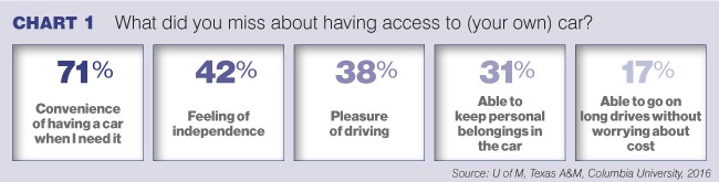 Some of the factors are also non-rational in nature. An interesting study was conducted by the universities of Michigan, Texas A&M and Columbia, following the cessation of service by Uber and Lyft in Austin, Texas, when the two companies withdrew as a protest against new local legislation. The survey asked consumers who had been using Uber or Lyft what they missed most about having a car and could no longer do when they used the ride-share services. See Chart 1 below for their responses.