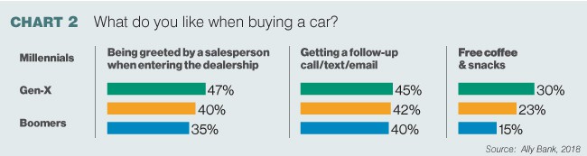 Finally, a study by Ally Bank in the U.S., no strangers to auto financing, shows that, regardless of what ownership model emerges, millennials won’t walk away from some traditional aspects of the customer experience. Don’t assume that millennials just want to consult their phone and aren’t really interested in basic human interaction. When asked what they liked when buying a car now, here’s how millennials, Gen X and Boomers responded (see Chart 2 below).