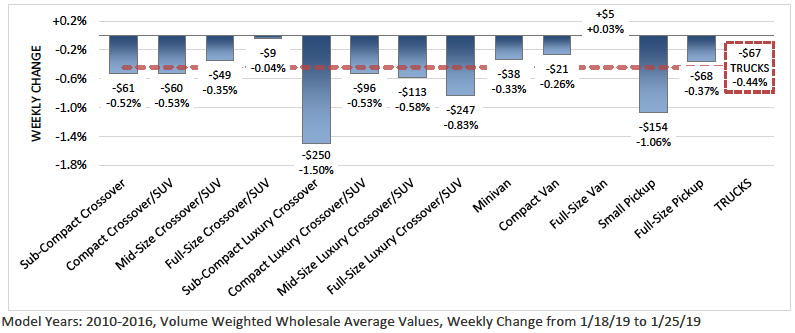 Values for the Sub-Compact Car and Compact Car segments saw only the slightest decline, whereas the values for the overall truck segment (which includes SUVs, pickups and vans) decreased 0.44% ($67) last week.
