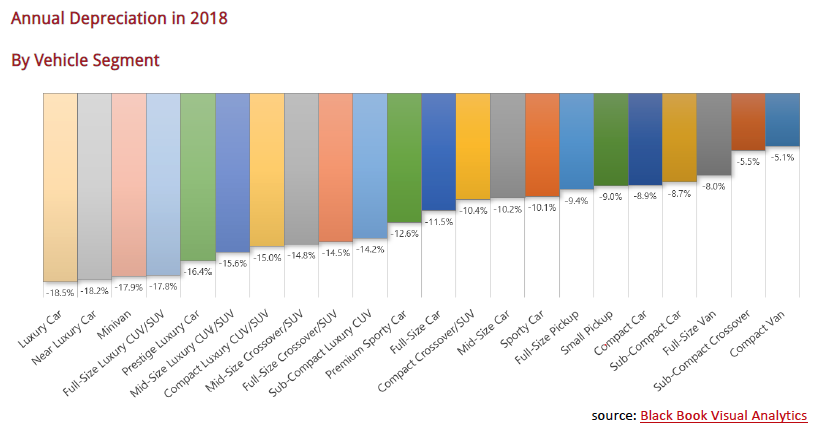 In 2018, the Luxury Car and Near Luxury Car segments experienced the highest depreciation rate (-18.5% and -18.2% respectively), while the Compact Car and Sub-Compact Car categories ended with the least depreciation for that year. This, according to Black Book, is an indicator that affordability is (in part) driving consumer demand for smaller, more mainstream used sedans in the U.S.
