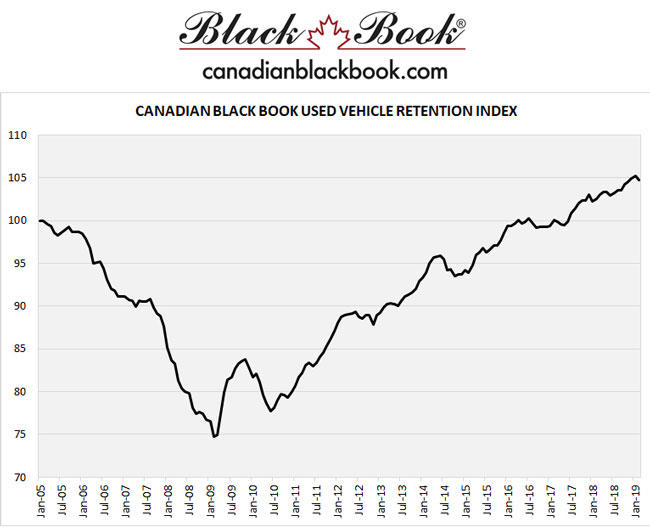 The Canadian Black Book Used Vehicle Retention Index for February has revealed a decline — the first since June 2018. The index dipped 0.5 points from January’s record high and is now resting at 104.7.