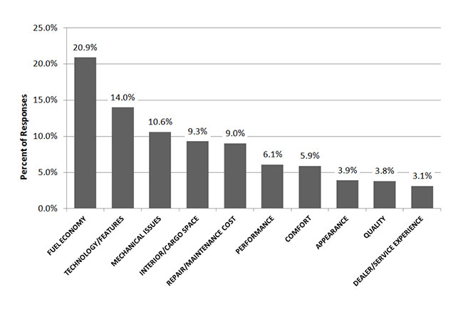 Mechanical issues came in third with 10.6%, and interior/ cargo space came in fourth with 9.3%. Other concerns include repair/ maintenance (9%), performance (6.1%), comfort (5.9%), appearance (3.9%), quality (3.8%), and dealer/ service experience (3.1%).