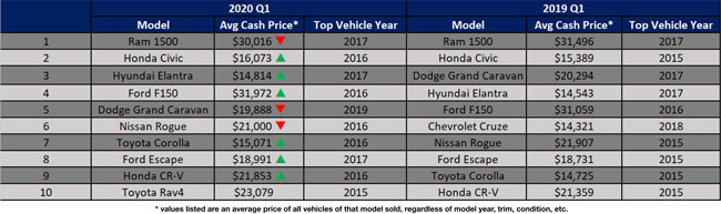 “When looking at our data and comparing the first quarter of 2020 and 2019, we see SUVs and Trucks taking an even stronger hold on the Retail Used Car market. The only small cars to make the top 10 were the Civic, Elantra and Corolla,” said Soklis.