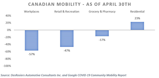 For example, as of April 30 mobility to workplaces was down 57% in Canada — according to Google mobility data. Workplace data is important because of the significant role vehicles play as the preferred method of commuting in Canada. More than 78% of working Canadians use this form of transportation.