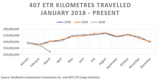 DesRosiers Automotive Consultants (DAC) often covers the impact of COVID-19 on new vehicle sales in Canada. But in considering the impact on the automotive aftermarket, the company found the “sudden and unprecedented” decline in kilometres driven to be one of the most striking aspects of this downturn.