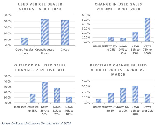 Less than 14% of used car dealerships in Ontario kept their stores open and running with regular hours in April, while the remaining percentage of dealerships were split between reduced hours or closure, according to DesRosiers Automotive Consultants (DAC).