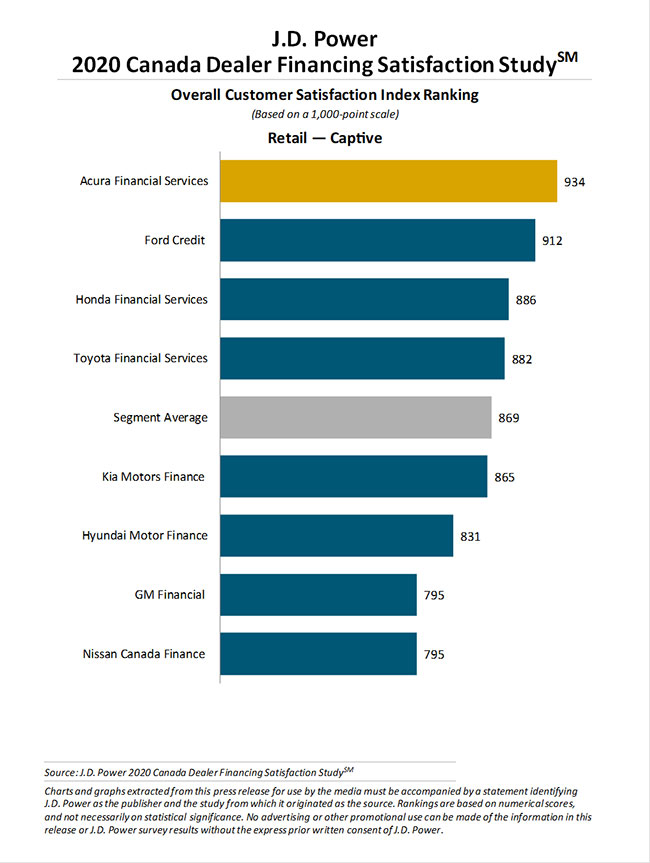 In terms of the rankings pulled from the study, Acura Financial Services ranked highest in the captive lender segment with a score of 934 (on a 1,000-point scale). Ford Credit (912) ranked second and Honda Financial Services (886) came in third. Overall satisfaction in the captive segment declined to 869 from 883 in 2019.