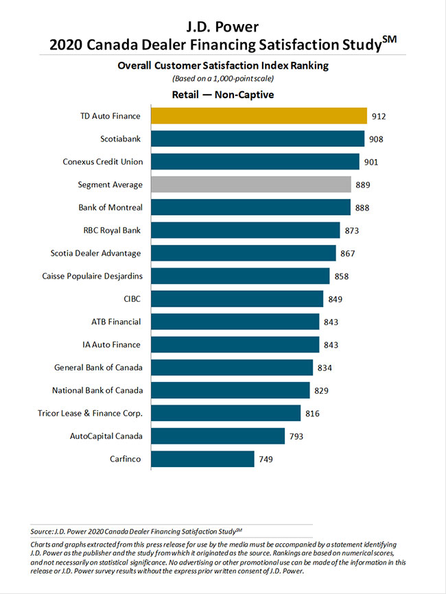 For non-captive lenders, TD Auto Finance ranked highest for the third consecutive year, with a score of 912. Scotiabank (908) came in second and Conexus Credit Union (901) ranked third. In the non-captive segment, overall satisfaction increased to 889 — up from 878 in 2019.