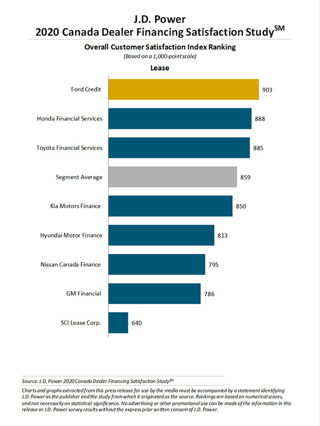 In the lease segment, which is new for 2020, Ford Credit ranked highest with a score of 903. Honda Financial Services (888) came in second and Toyota Financial Services (885) was third on the list. The lease segment’s overall satisfaction score is 859.