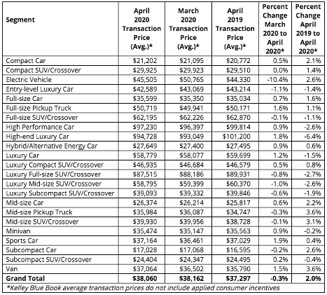 “Another sign of shifting preferences in April 2020 is at the brand level,” said Kelley Blue Book in its news release. “Luxury brands were down 2.5%, while non-luxury brands rose 4%. Nearly all luxury segments saw declines, while only one non-luxury segment was noticeably down (full-size SUVs).”