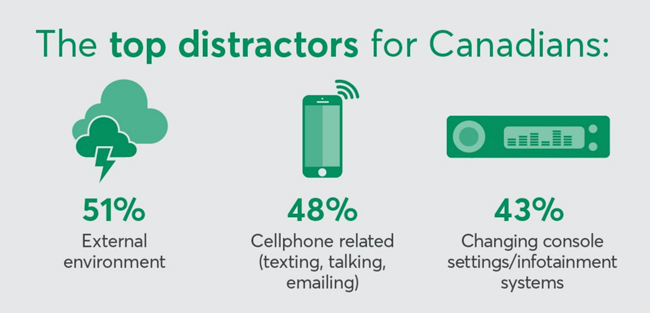 External environments, cell phone use (texting, talking, and emailing), and changing console settings/infotainment systems are the top factors distracting Canadians when driving a vehicle, according to a web survey conducted by Ad Hoc Research for Desjardins.