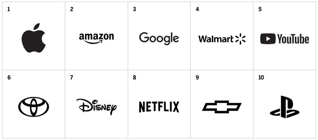 A first look across all industries reveals the top 10 brands are Apple with a score of 74), Amazon (69.4), Google (66.9), Walmart (59.7), YouTube (58.6), Toyota (56.9), Disney (55.9), Netflix (55.2), Chevrolet (54.7), and PlayStation (54.2).