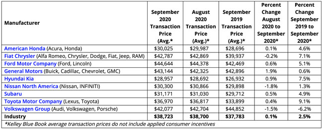 The estimated average transaction price for a light vehicle in the United States was $38,723 in September, with new vehicle prices jumping 2.5 per cent ($940) year-over-year while climbing 0.1 per cent ($23) from last month, according to Kelley Blue Book.