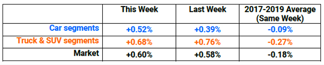 The vehicle segment that saw the highest week-over-week price increase was cars (+0.52%). Truck/SUV segments also showed a very strong performance (+0.68%), although increases were not as strong as compared to the prior week.