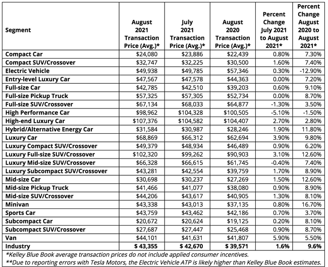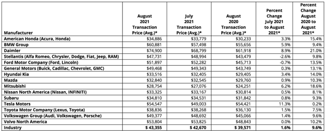 New vehicle prices in the United States reached another all-time high in August 2021, for the fifth consecutive record-setting month thanks to an average transaction price of $43,355—up nearly 10% ($3,789) from August 2020 and up 1.6% ($685) from last month, according to Kelley Blue Book.