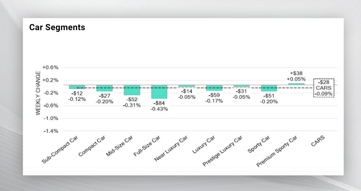 In the car category, the segments with the largest reductions were full-size cars (-0.43%) and mid-size cars (-0.31%). Compact cars and sports cars had the same decrease (-0.20%). And premium sports cars experienced an increase of +0.05%.