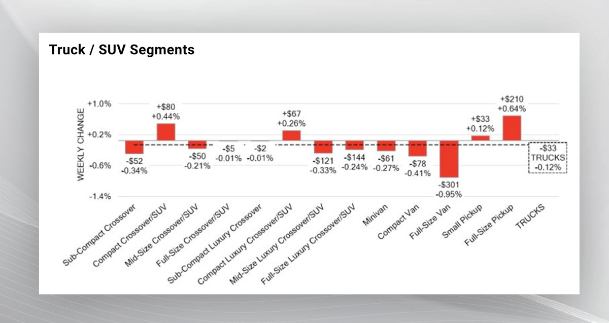 The report also found car segment prices slipped -0.09% from -0.16% a week earlier, while truck/SUV segment prices decreased by -0.12% (which is more than the prior week.) The largest declines in the car segments came from full-size cars and mid-size cars. For truck/SUV segments, it was full-size vans and compact vans. “Just under 19% of the market segments experienced an average value change of more than ±$100,” said CBB in its Market Insights report.