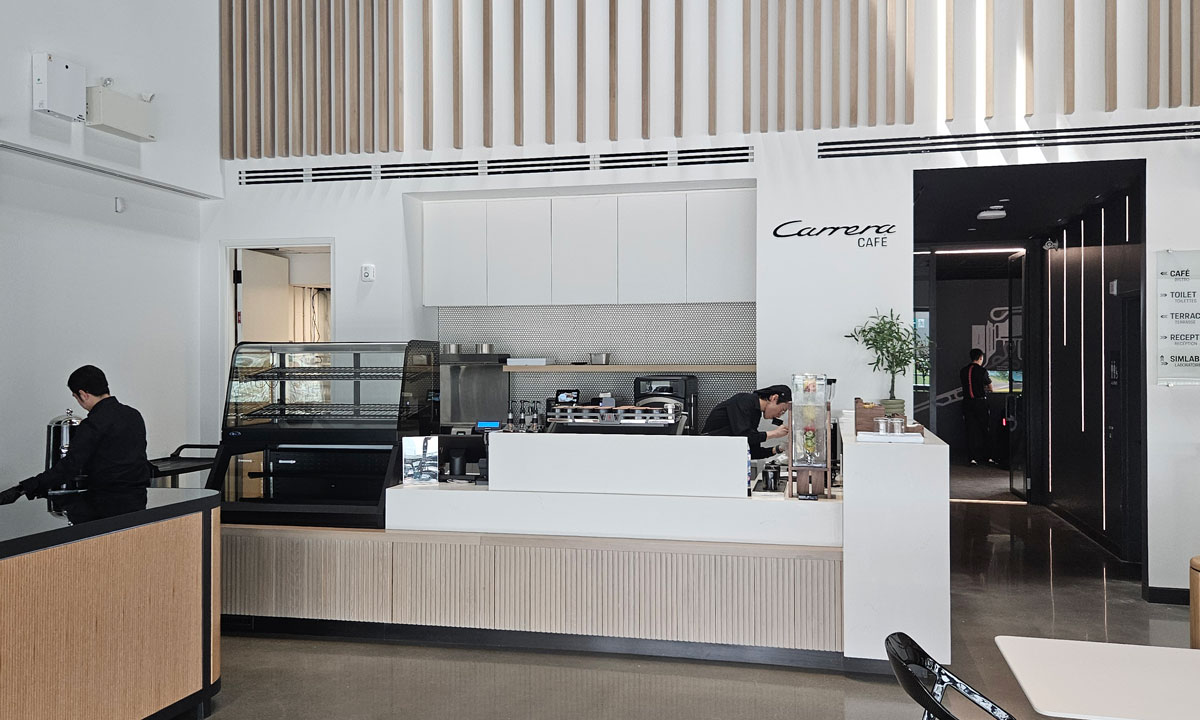 The building has a view to the tracks and has a main floor that includes: a room with five virtual Porsches to race individually or against someone else on tracks from around the world; a lifestyle shop with a selection of apparel, accessories, model cars and other products; a Carrera café that has artisanal coffee and various culinary creations; and display cars. There is also an upper level to incorporate meeting rooms to accommodate groups.