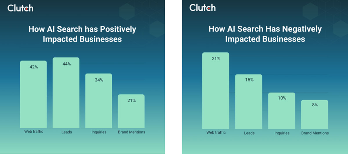Clutch said small businesses benefit from AI-powered search and chatbots. Their data points to 44 per cent of these businesses reporting more leads, 42 per cent more website traffic, and 33 per cent more inquiries. And despite referral traffic concerns, they say small businesses are gaining visibility.