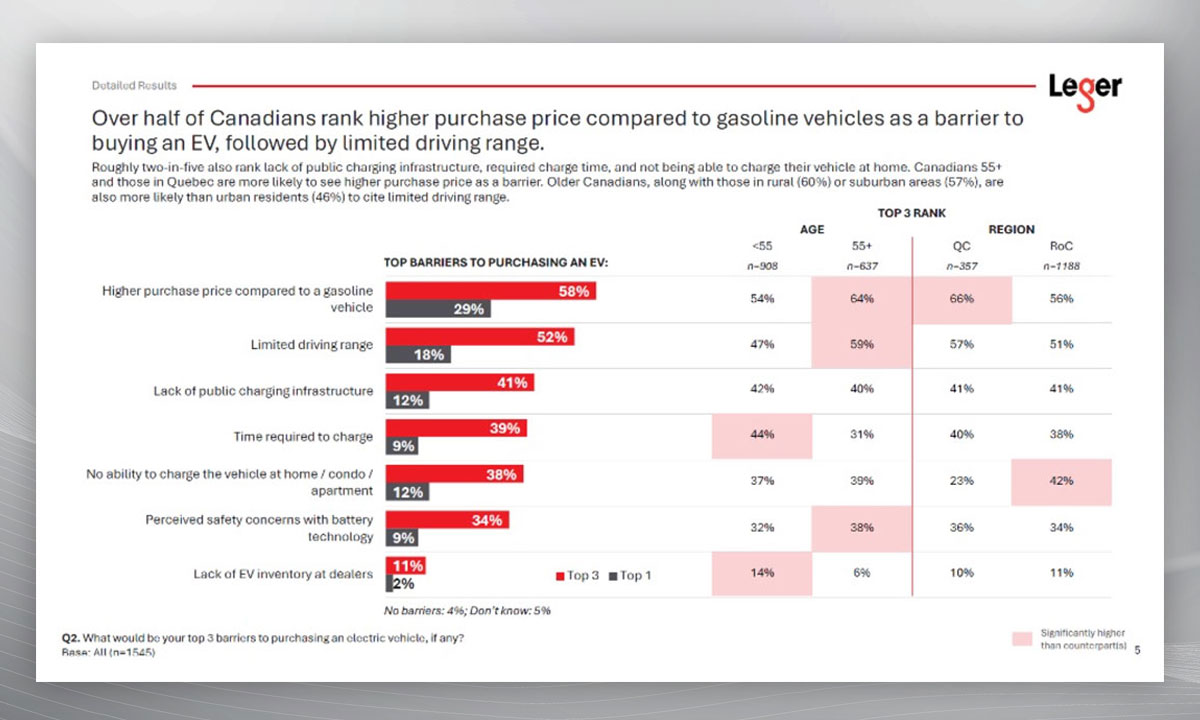 The poll also suggests that vehicle availability at dealerships, once a prominent concern, is no longer viewed as a major barrier, with only 11 per cent citing it. Instead, Canadians continue to flag affordability, driving range and charging access as the factors limiting adoption.