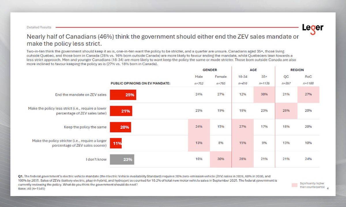The Leger poll, commissioned by the Canadian Vehicle Manufacturers’ Association (CVMA), Global Automakers of Canada (GAC) and the Canadian Automobile Dealers Association (CADA), found that only 31 per cent of respondents support the policy, while nearly half (46 per cent) would like to see it scaled back or scrapped.