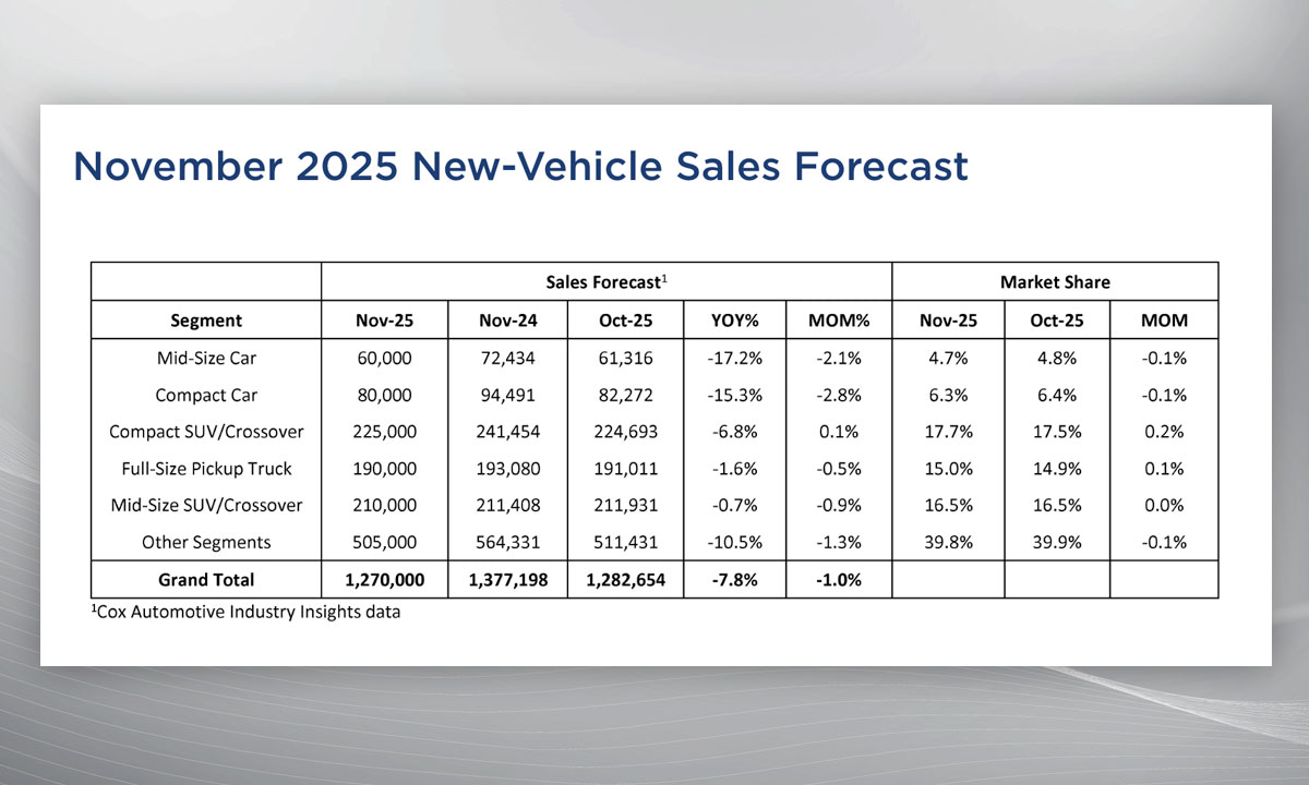 Cox Automotive projects a seasonally adjusted annual rate of 15.7 million, slightly ahead of October but below last year’s 16.5 million. Sales volume is forecast to reach 1.27 million units, down 1 per cent from October and nearly 8 per cent year over year. Fewer selling days (25 this month) account for part of the decline.