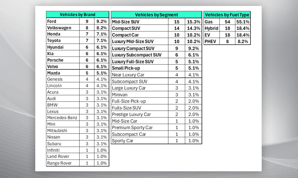 On the broader market, CBB said mid-size SUVs dominated testing in 2025, representing 15.3% of models tested — plus another 10.2% from luxury mid-size SUVs. Electrified vehicles were also prominent: EVs and hybrids each represented 18.4% of testing, while CBB pointed to plug-in hybrids as an under-served category with growing opportunity.