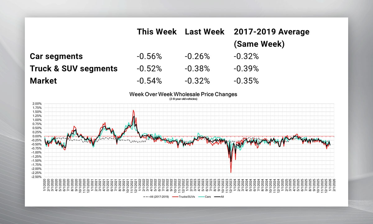 For the week ending Jan. 3, overall wholesale pricing dropped 0.54 per cent, compared with a 0.32 per cent decline the previous week. Car segments were down 0.56 per cent and truck/SUV segments fell 0.52 per cent, according to Canadian Black Book’s first Market Insights report for 2026.