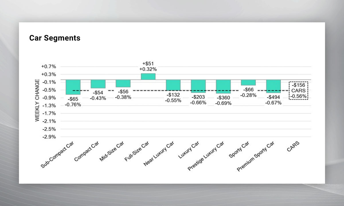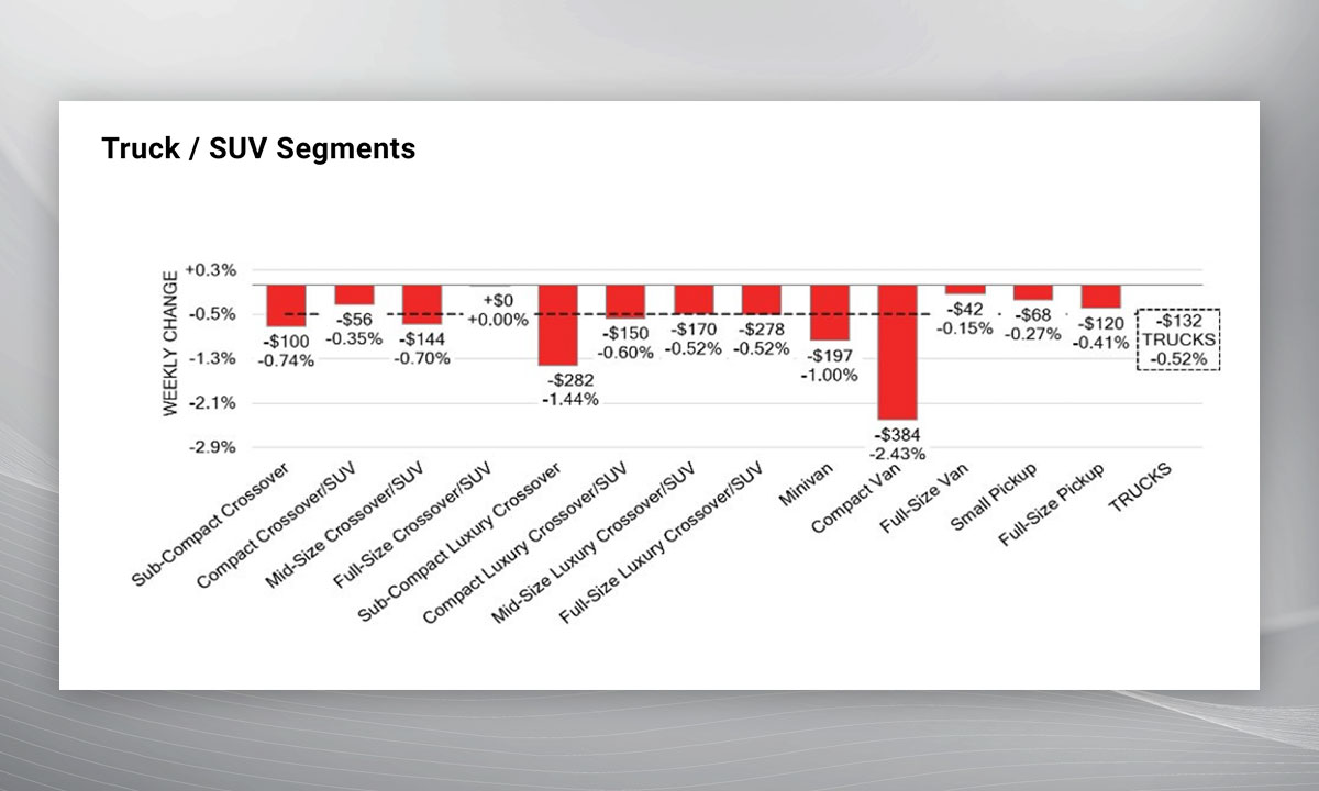 On the truck/SUV side, weakness was led by compact vans (-2.43 per cent) and sub-compact luxury crossovers/SUVs (-1.44 per cent). Minivans (-1.00 per cent) and sub-compact crossovers (-0.74 per cent) also posted notable declines. Full-size crossovers/SUVs were flat.