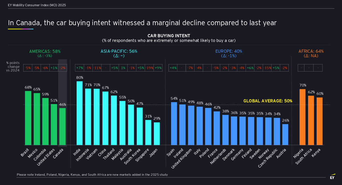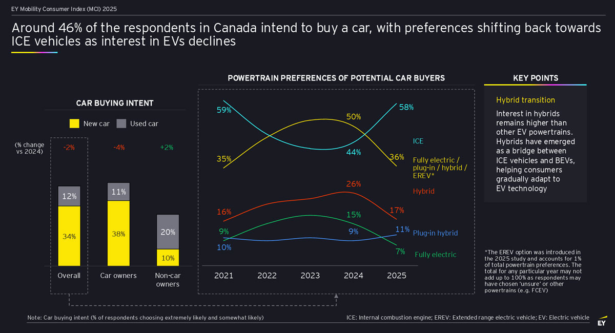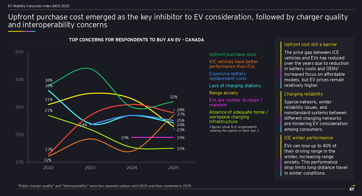 The findings align with broader trends in EY’s Mobility Consumer Index, which has shown EV interest in Canada levelling off in recent years as concerns around charging infrastructure, costs and range continue to shape consumer sentiment.
