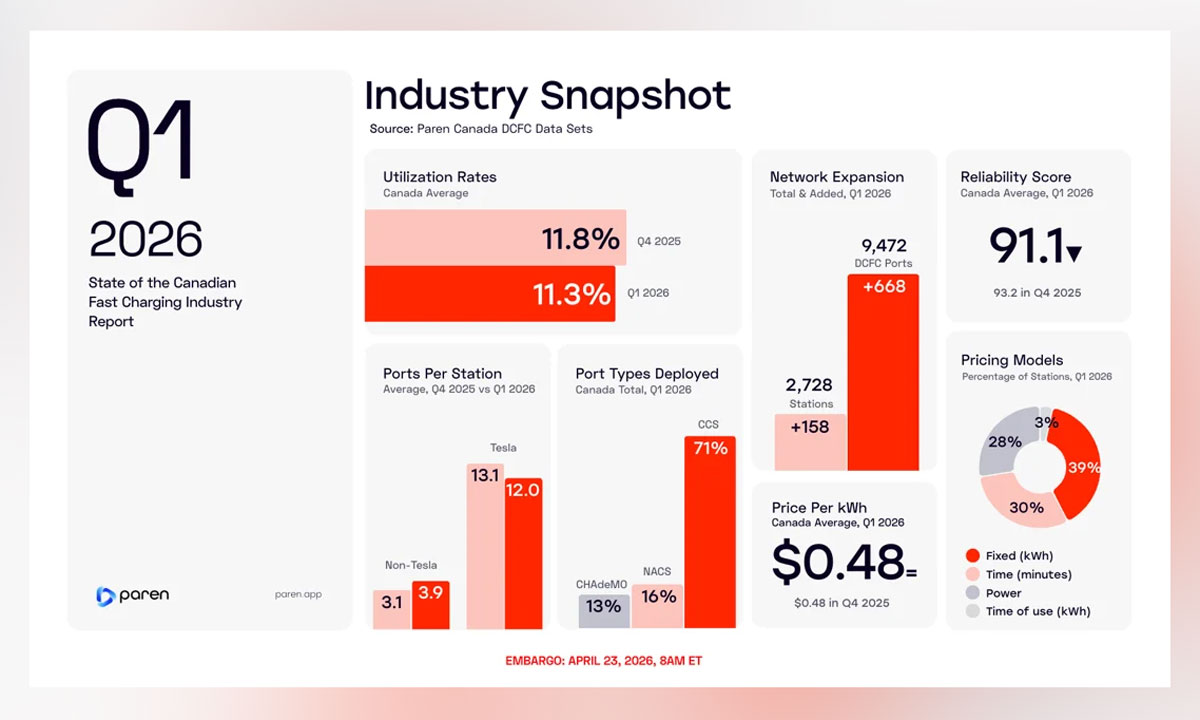 Canada’s EV fast-charging network continued to expand in the first quarter of 2026, with growth increasingly focused on higher-capacity sites rather than broader geographic coverage, according to a report from Paren.