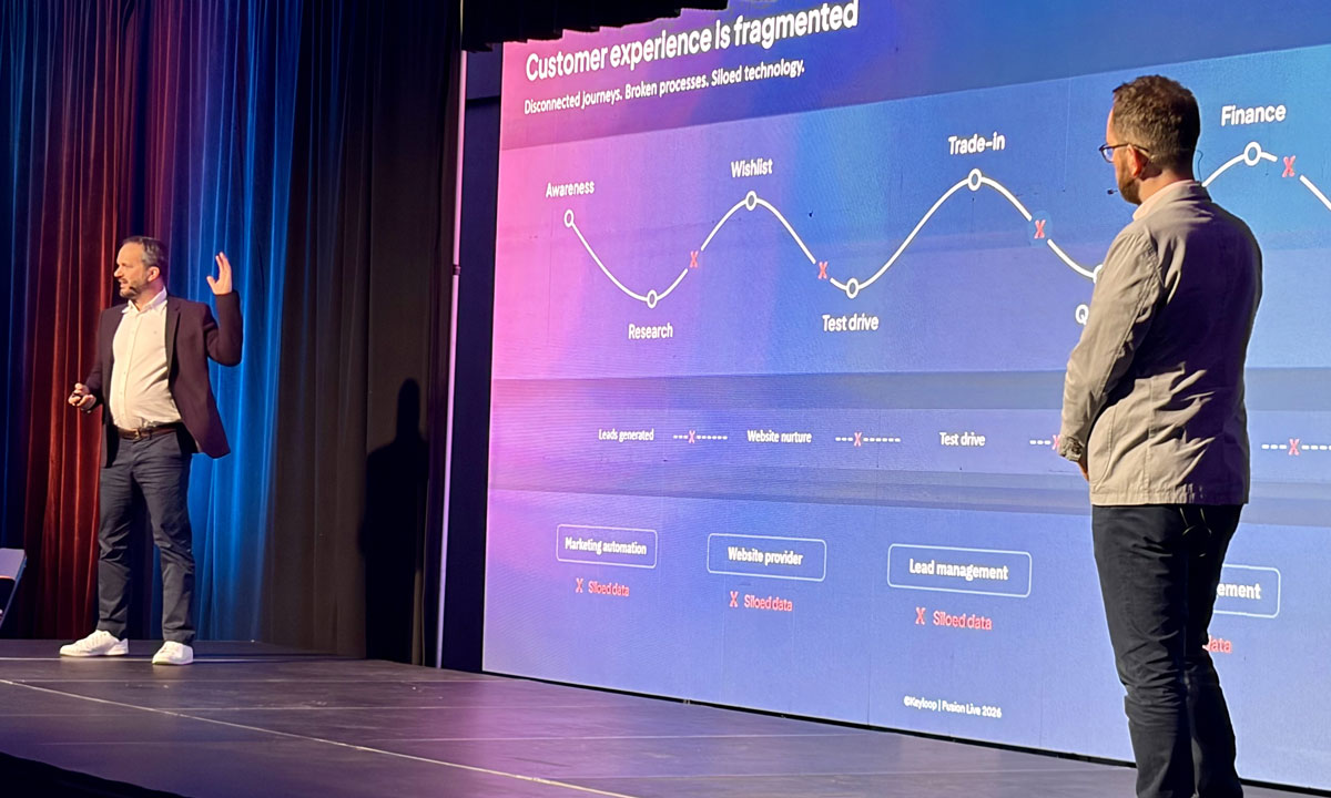 Adrian Nash, Keyloop’s Chief Product Officer, and James King of Fusion’s newly-acquired firm motortech.ai took the stage next to explain how Keyloop is trying to respond to those same problems through Fusion and embedded AI.